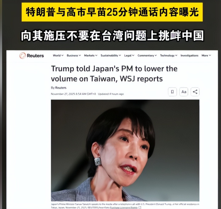 值得注意的是特朗普对高市早苗的训斥,并不意味着美国会放弃干涉台海事务,而是想将台海问题的主导权牢牢掌握在自己手中,不允许日本等盟友擅自加码。