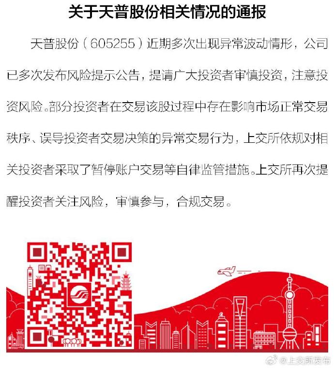 上证报中国证券网讯 据上交所发布微博消息,上交所发布关于天普股份相关情况的通报显示炒股配资咨询,天普股份(605255)近期多次出现异常波动情形,公司已多次发布风险提示公告,提请广大投资者审慎投资,注意投资风险。部分投资者在交易该股过程中存在影响市场正常交易秩序、误导投资者交易决策的异常交易行为,上交所依规对相关投资者采取了暂停账户交易等自律监管措施。上交所再次提醒投资者关注风险,审慎参与炒股配资咨询,合规交易。