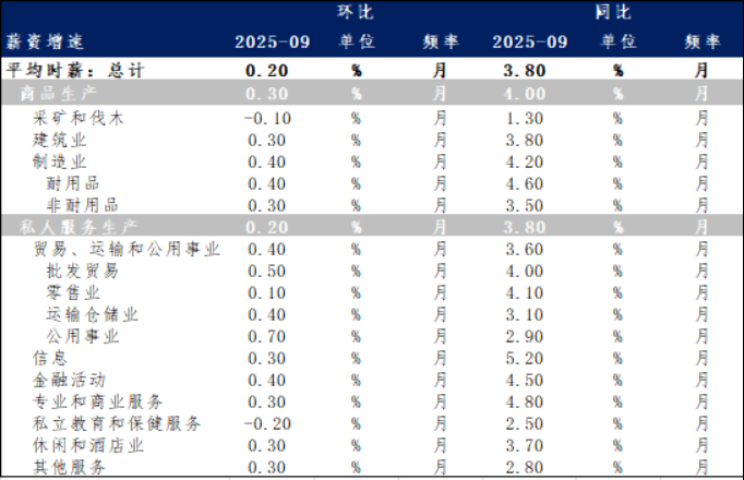 美国九月失业率升至4.44%,接近4.5%的心理关口。失业率上升伴随劳动力供应的边际改善,劳动力参与率微升至62.4%,但仍低于四月份的62.6%。虽然家庭调查衡量的就业人数增加25.1万,但失业人数亦同步上升(+21.9万)。尽管关于维持劳动力市场平衡所需就业增速的争论持续,但九月份失业率的进一步攀升表明,近期的增长动力至少略显不足。尽管私人机构数据表明企业裁员率近月显著上行,但失业率的攀升并非仅仅由裁员驱动,而或由劳动力供需的错配所致。随着通胀对家庭资产负债表的侵蚀,越来越多的边际劳动力(如退休返聘人员、家庭主妇)被迫重新进入劳动力市场寻找工作,导致劳动力参与率上升,但私营部门却无力提供足够的岗位来吸纳这些新增供给。这种供需缺口的扩大,是经济放缓的典型特征。平均时薪环比上涨0.2%,同比增幅维持在3.8%,持续超越过去12个月3.0%的CPI通胀增速,薪资增速仍维持较强韧性,为居民的消费支出提供较强支撑,但或加剧未来通胀粘性。