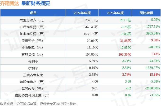 据证券之星公开数据整理,近期齐翔腾达(002408)发布2025年年报。根据财报显示,齐翔腾达净利润同比下降1767.51%。截至本报告期末,公司营业总收入237.7亿元股票配资客服,同比下降5.75%,归母净利润-5.75亿元,同比下降1767.51%。按单季度数据看,第四季度营业总收入55.58亿元,同比下降19.05%,第四季度归母净利润-4.29亿元,同比下降164.61%。
